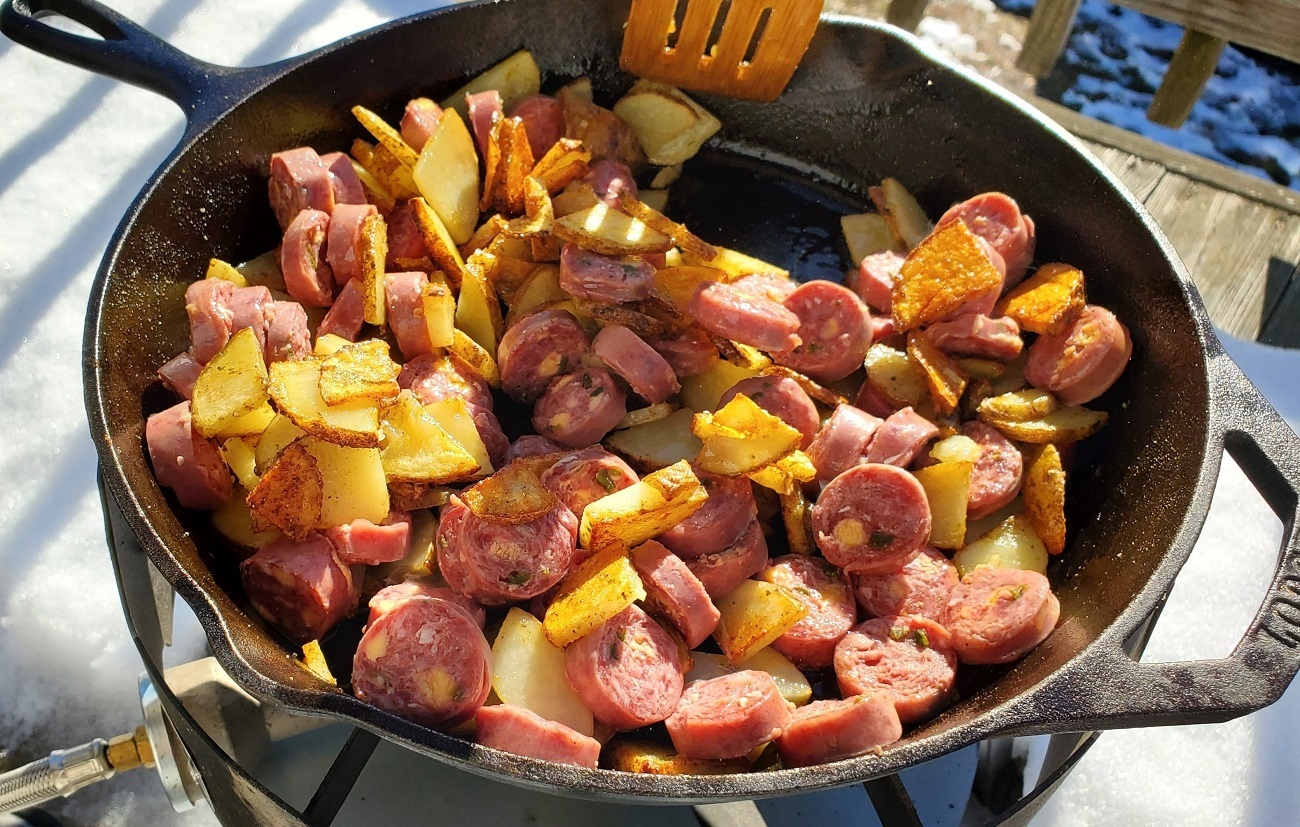 Andrea and her husband hauled out the camping gear to prepare this dish. It cooks up equally well on a propane burner outdoors or in a frying pan over the stove. So, whether you're gathered around the kitchen table or seeking a culinary experience while camping, this venison kielbasa dinner fits the bill and embraces the joys of both hunting and cooking.